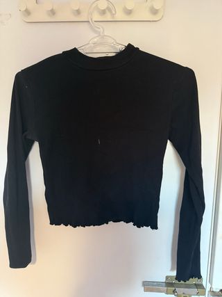 Top femenino de manga larga con cuello alto y detalle de volantes en el bajo. - Tejido acanalado. - Corte cropped.