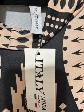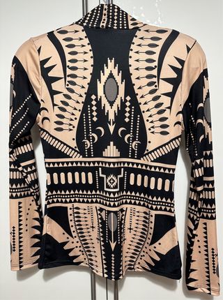 Top con un llamativo estampado tribal en negro y beige. Su diseño único lo hace destacar. - Manga larga. - Cuello alto. - licra fina