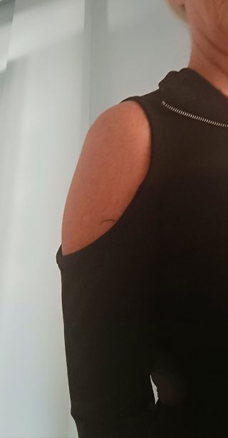Preciosa camiseta de manga larga, color negro, con aberturas en los hombros. Es entallada y tiene un cierre de cremallera. - Es una prenda elegante y cómoda. - Perfecta para una ocasión especial o para el día a día.