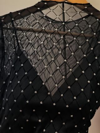 Preciosa camiseta transparente negra con detalles plateados. Es de manga larga y tiene un bonito escote en v. - Es transparente, lleva cazuelas. - Está con la etiqueta