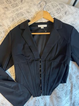 Chaqueta corta negra de la marca HYFVE, talla S/36/8. Es una prenda elegante y entallada. - Diseño tipo corsé con detalles en la parte delantera. - Mangas largas. - Cierre con ojales metálicos.