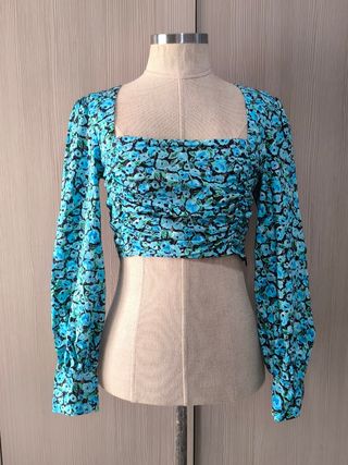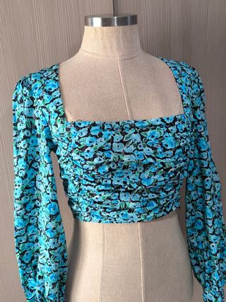 Preciosa camiseta corta con estampado floral. Es de color azul y negro, con mangas abullonadas. - Diseño entallado - Escote cuadrado - Mangas largas