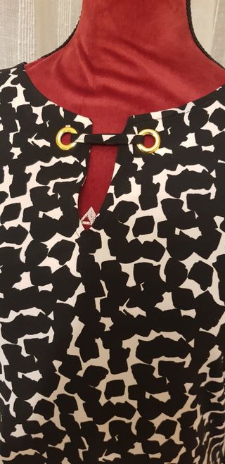 Talla M. Forrado. Con bolsillos laterales. Goma elástica en la cintura. Manga 3/4. Espectacular espalda atada con una lazada. Es ideal. Hombros 38 cm Sisa 49 cm Cintura 38 cm (adaptables) Largo 82 cm Topos negros. 100% poliéster.