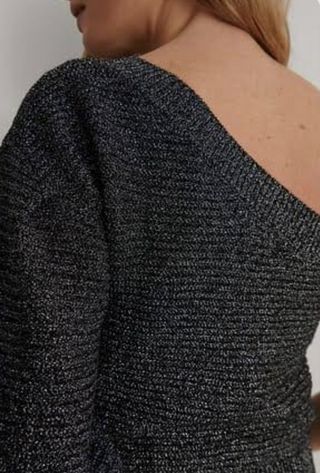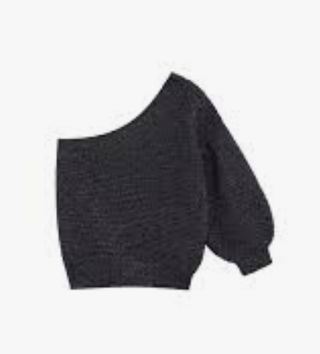 Precioso top de punto con un diseño asimétrico, de la marca Mango. Es de color negro con detalles plateados. Medidas: Sisa a sisa 46 cm. Largo 55 cm. - Tejido suave y ligero. - Manga abullonada. - Corte favorecedor. -Da para talla L y XL. -Puesto solo una vez, sin etiqueta.