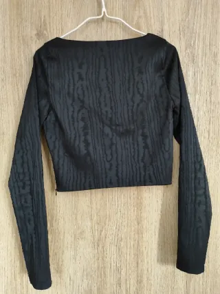Top corto en tejido negro mate con efecto marmoleado, corte entallado y escote estructurado tipo corset. Manga larga y cierre lateral invisible, ideal para looks de noche o eventos donde quieras algo especial. No se ha usado. Descuento por lote a partir de 2 artículos 💫 Envío rápido y con mimo 💌 Zara, top corset, noche, negro mate, fiesta, manga larga, marmoleado, crop, Inditex