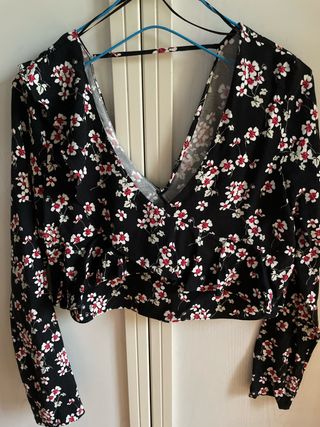 Precioso top de Zara con volante en el escote. Fondo negro y estampado floral. - Diseño con escote pronunciado, delante y detrás - Manga larga, sin puño pero con botón - Corte crop.
