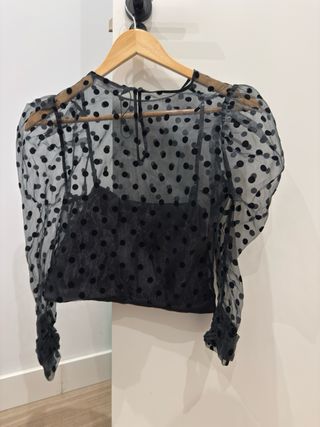 Elegante top negro con un diseño de lunares transparente. Perfecto para añadir un toque sofisticado a tu atuendo. - Mangas abullonadas. - Transparencia con lunares. - Incluye top interior.