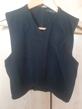 Top negro de Zara, corte ajustado. - Escote redondo. - Sin mangas. - Corte cropped.