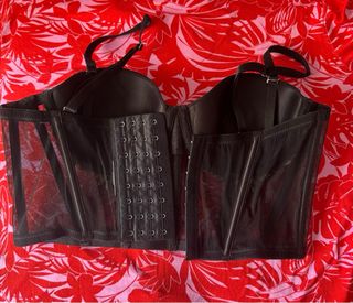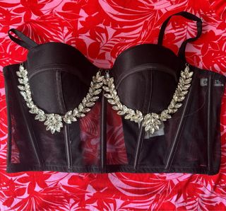 Este crop top negro es una pieza llamativa y elegante. - Diseño tipo corsé. - Detalle de pedrería en forma de hojas de laurel. - Tejido de malla transparente en la parte inferior.