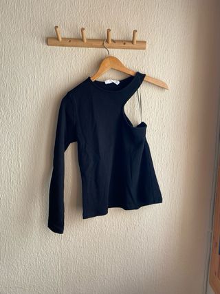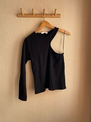 Top negro asimétrico comprado en Stradivarius, talla S. Por un lado tiene manga larga, y por el otro un tirante finito. Además tiene una cremallera lateral. Es muy bonito y elegante. SIN ESTRENAR.