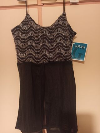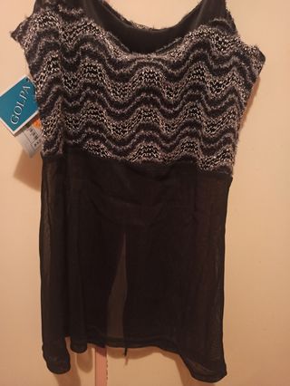 Preciosa camiseta de tirantes de la marca Golpa. Es de color negro y plateado, con un diseño de ondas. La parte superior es de tejido de punto y la inferior es de tul. Es una prenda elegante y cómoda, ideal para cualquier ocasión. - Diseño de ondas - Tejido de punto y tul - Talla única