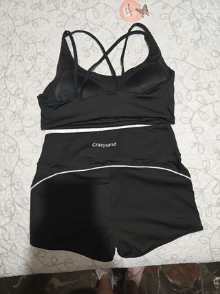 Conjunto deportivo de dos piezas en color negro. Está nuevo sin estrenar. - Top deportivo con tirantes cruzados en la espalda. - Pantalones cortos con ribete blanco.