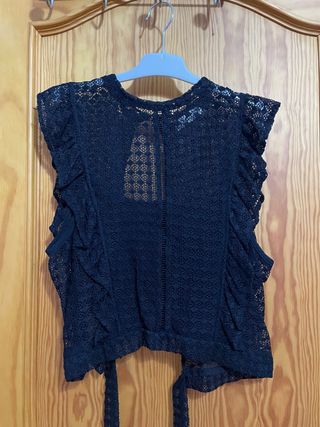 Elegante top de Zara con detalles de encaje. - Tirantes finos. - Escote en V con borde de encaje. - Mangas cortas de encaje. - Diseño asimétrico. este año esta igual en temporada esta nuevo