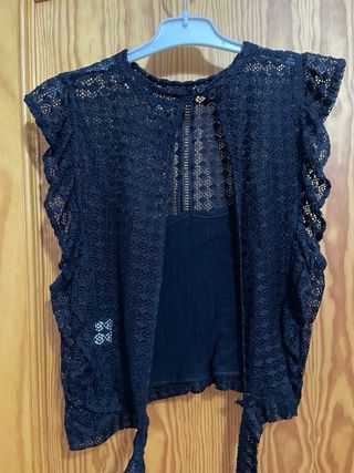 Elegante top negro con tejido plumeti y detalles de encaje. - Tirantes finos ajustables. - Escote con detalle de encaje. - Bajo con puntilla. - Diseño ligero y vaporoso. Nunca estrenado Muy elegante y perfecto fondo de armario