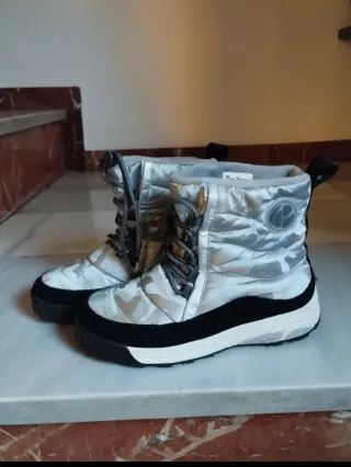 Botas de nieve, modelo Jarvis Camu de la marca Pepe Jeans London. Tienen un acabado plateado con estampado de camuflaje y detalles en contraste negro. Material: Parte superior de nailon acolchado con forro interior suave y cálido para proteger del frío..Suela gruesa, fabricada en Phylon y goma para ofrecer tracción y ligereza. Cierre: Sistema de cordones ajustables con un tope ajustable para un ajuste seguro. Estado: muy poco uso, plantillas intactas. Condidero que es más un 38 que un 37. Como mínimo un 37,5...Me estàn muy grandes a prsar de calzar yo el Nº,37.
