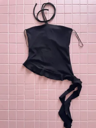 Top negro elástico de cuello halter con detalle de lazada para anudar al cuello. Escote recto y hombros descubiertos. Detalle de volantes en el lateral, estilo Y2K. Nuevo con etiquetas.