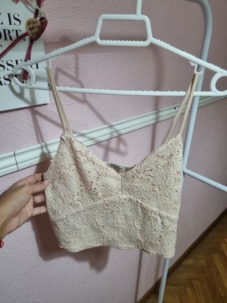 Precioso top de encaje en color rosa palo. Es un top corto con tirantes finos. - Diseño de encaje floral. - Espalda panel de abeja elástico - Tirantes ajustables.