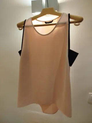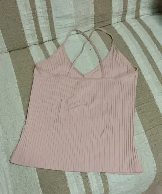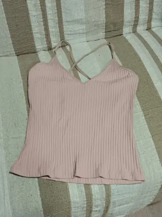 Top de tirantes color rosa pálido. Pone talla M, pero es una S. Marca Mango. Poco uso, en perfecto estado. - Diseño acanalado. - Tirantes cruzados en la espalda. - Escote en V. - Tejido elástico y fresco. Por la compra de una prenda, regalo otra de precio similar.