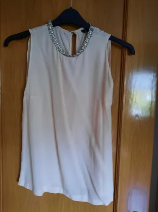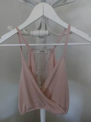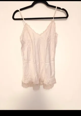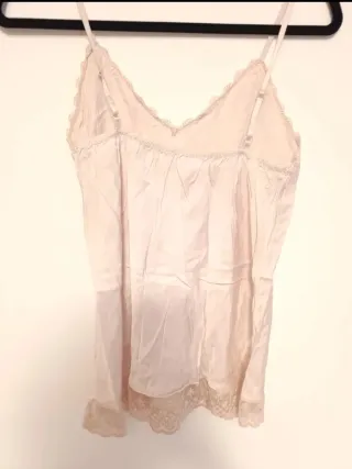 Top de tirantes fino con acabado satinado. ✂️ Diseño con lazada en la parte trasera. Corte holgado y ligero. 🧶 Tejido: No elastico. 📏 Talla: XS 🔖 Marca: Lefties ✨️ Estado: Puesto solo 1 vez 👚 Ocasion: Cualquiera