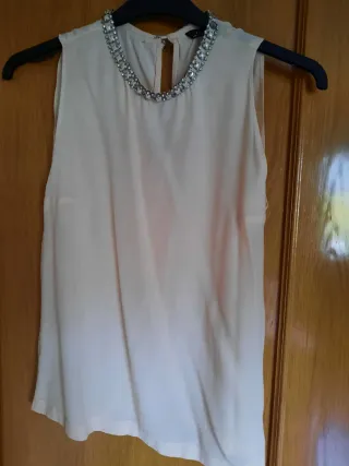 Elegante top sin mangas con un detalle de pedrería alrededor del cuello. - Cuello adornado con pedrería. - Diseño sin mangas. - Color rosa pálido.