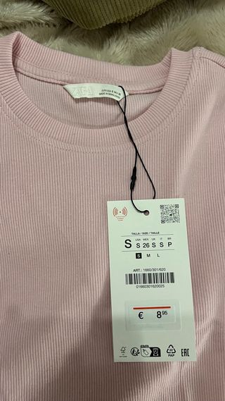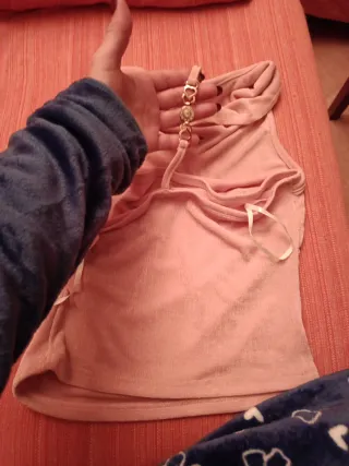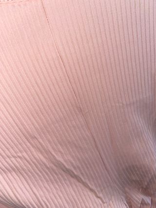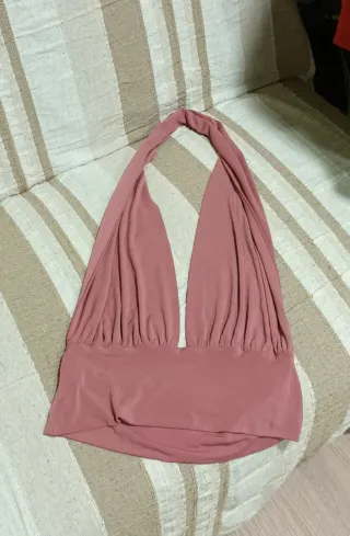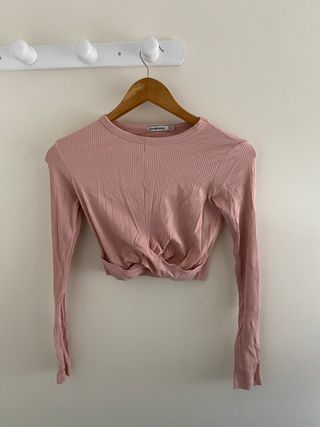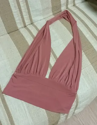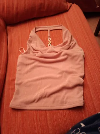 Top tipo crop canalé cruzado, talla S, color rosa palo. Prácticamente nuevo. Mide 40 cm de largo y 33 cm entre sisas, pero cede bastante. Con mucha caída, queda precioso
