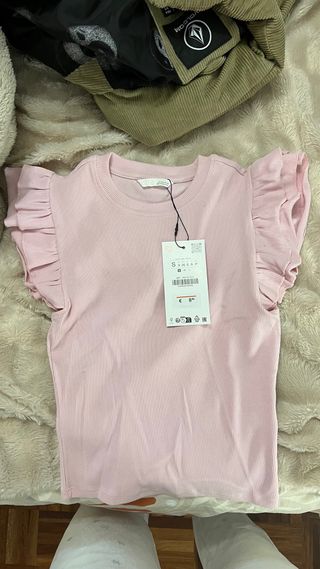 Precioso top de Zara con un diseño muy favorecedor. - Manga corta con detalle de volantes. - Tejido acanalado. - Color rosa palo/nude. - Talla S. - Con etiqueta, sin estrenar.