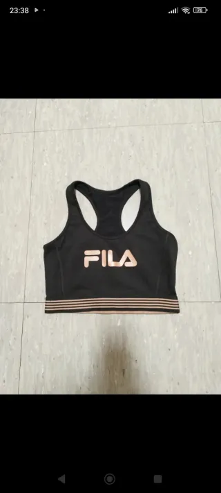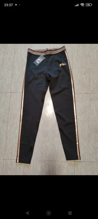 Conjunto original FILA con las mallas sin estrenar y el top usado en una ocasión, (en perfecto estado). Es de color negro con rayas laterales en tono rosa palo brillante. Es un conjunto elegante, de tejido cómodo, suave y perfecto.
