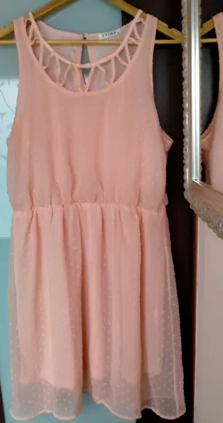 Vestido rosa palo de tela ligera con un delicado estampado de topos en relieve.Sin estrenar. - Diseño sin mangas. - Escote con detalle de tiras. - Cintura elástica. -Talla XL.