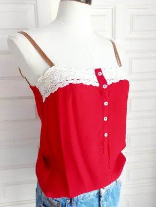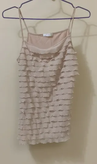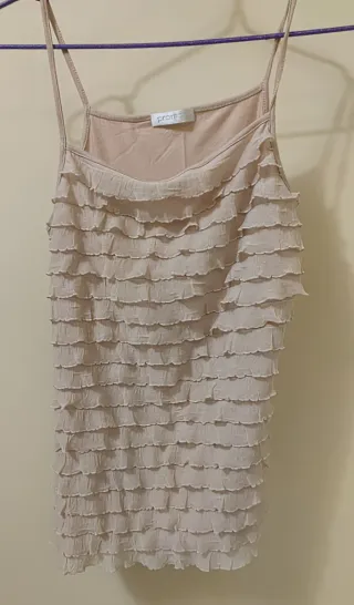 - Como nuevo , puesto solo en una ocasión. Top de tirantes con múltiples volantes en la parte delantera. Un diseño coqueto y femenino. - Volantes en cascada. - Tirantes finos. - Tejido ligero.