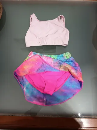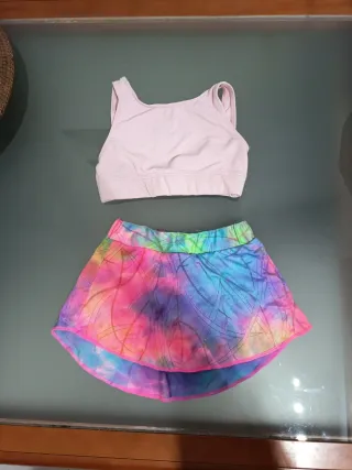 Conjunto deportivo de falda y top con un diseño vibrante y llamativo. - Top de entrenamiento en tono rosa pálido. - Falda con estampado tie-dye multicolor. Talla 6-8 años
