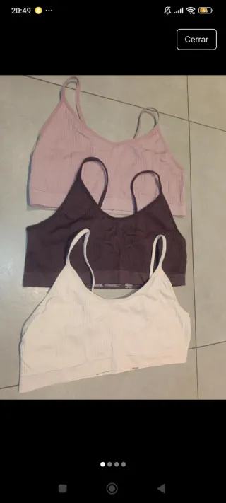 Conjunto de tres tops de mujer, perfectos para el día a día o para hacer deporte. Son cómodos y versátiles. - Top de color rosa palo. - Top de color morado. - Top de color blanco roto. - Tejido acanalado. Tienen la opción de poner relleno.