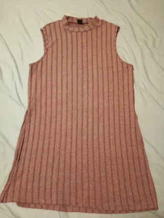 En muy buenas condiciones. Color rosa palo con brillo, precioso. Escote drapeado / cowl. Favorece un montón . Los tirantes tienen algún hilito fuera del roce, pero sin importancia (última foto). Sencillo pero a la vez muy festivo. Podría dar para una M porque viene holgado