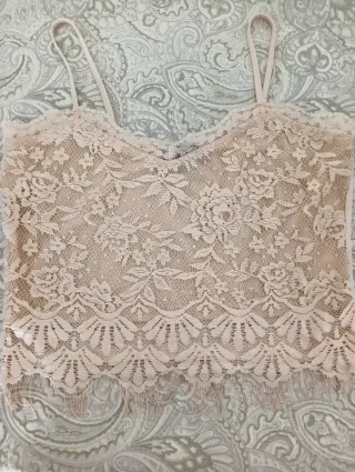 Precioso top corto de encaje con un delicado diseño. - Tirantes finos. - Escote festoneado. - Tejido de encaje floral. En perfecto estado