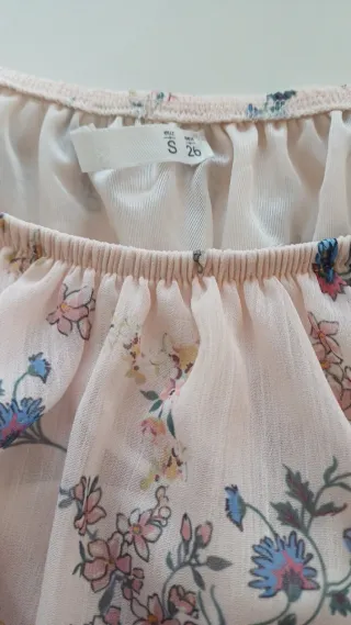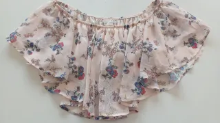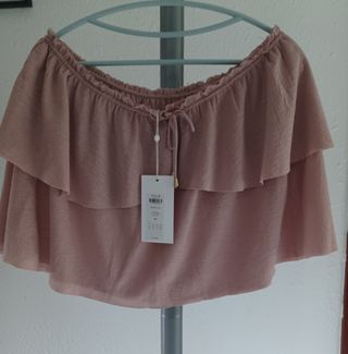 Top en color rosa palo, con un diseño de volantes. Estilo bardot hombros descubiertos. Se ajusta con goma y lazada en el pecho. Ralla xs pero sirve para S y M al se elástico - - Tejido ligero y vaporoso.