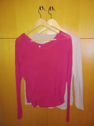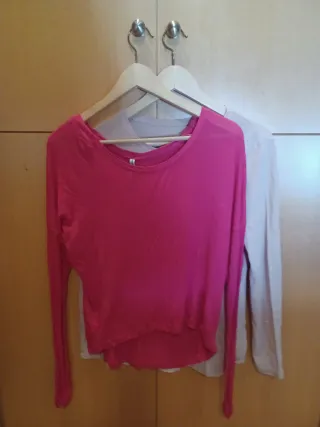 SÓLO ENVÍO CON CORREOS. EN MANO, EN MI DOMICILIO. Conjunto de dos prendas superiores de tela ligera y cómoda, para entretiempo. - Prenda básica de color rosa palo, de cuello redondo y manga larga. MARCA: PRIMARK. TALLA: M. - Prenda de corte cropped de color rosa fucsia, de cuello redondo y manga larga (para poner encima de la básica). MARCA: STRADIVARIUS. TALLA: XS. ROPA DE SEGUNDA MANO: Uso normal. CONJUNTO COMPLETO: 5€. NO SEPARO.
