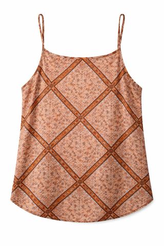 Blusa con estampado geométrico y floral. - Tirantes finos. - Escote halter. - Diseño con rombos y detalles florales. - Base en color rosa pálido.