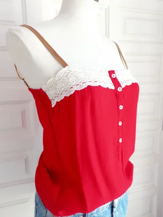 Este top de encaje es una prenda delicada y femenina. - Diseño de encaje floral. - Ribete festoneado en el bajo. - Tirantes finos.