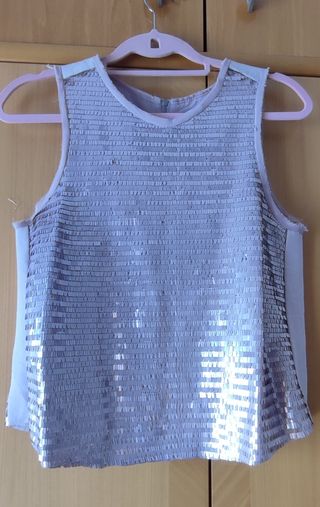 top de lentejuelas rosa pálido, cierre cremallera, 55 cm largo y 46 cm sisa, talla S