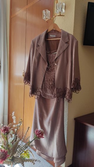 Precioso conjunto 3 piezas ideal para ceremonias, madrina de boda, evento,color rosa palo con bordado y fina pedrería y forro de raso del mismo tono. Se compone de top de tirante ancho con ballenas laterales, falda midi algo más larga por detrás, que le confiere una elegancia y chaqueta a juego. Puesto en una boda.