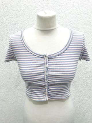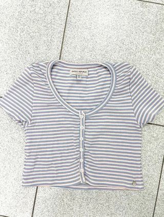 Descubre este encantador crop top a rayas pastel de Pull & Bear. Esta camiseta estilo baby tee de manga corta está confeccionada en tela de canalé con rayas en tonos rosa palo, azul y lila. Tiene un detalle de escote ribeteado y botones en la parte frontal, complementado con una medalla metálica de la colección. Es parte de la colección de edición limitada Pacific Republic de Pull & Bear, y su estilo es muy dulce y femenino. La camiseta es de talla M, fabricada en algodón elástico y se encuentra en perfecto estado. ¡Añade un toque encantador a tu armario con esta prenda única!