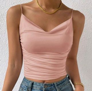 Preciosa blusa de color rosa palo. Es de tirantes finos y tiene un diseño fruncido en la parte inferior que le da un toque muy favorecedor. - Es de un tejido suave y ligero. - Perfecta para cualquier ocasión.