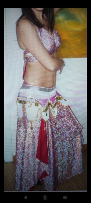 Conjunto falda y top, color rosa con destellos. Falda talla M elástica Top ajustable según talla de pecho NO se vende por separado NO incluye pañuelo