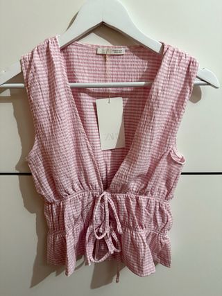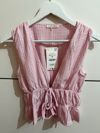 Top de Zara con un diseño de rayas finas en tonos rosas. Presenta un escote pronunciado y un detalle de lazada en la parte delantera. - Diseño sin mangas. - Tejido texturizado. - Cintura elástica con volante.