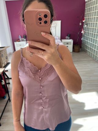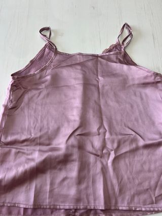 Precioso top en tonos rosa y beige. Es una prenda delicada y elegante, ideal para ocasiones especiales. - Confeccionado en satén y encaje. - Diseño tipo corsé. - Tirantes finos ajustables.