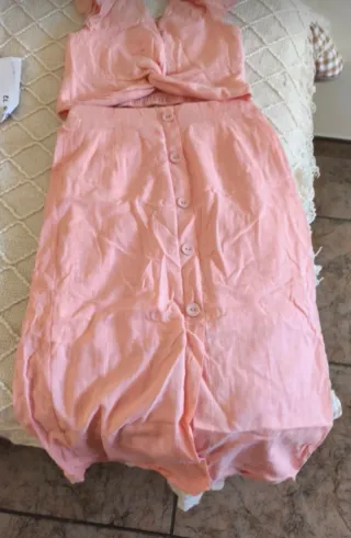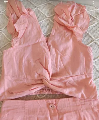 Conjunto de dos piezas en color coral. - Top con nudo frontal. - Falda midi con botones. - Tejido ligero. Queda precioso y se puede poner en conjunto o separado. Muy fresquito.8