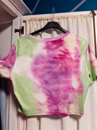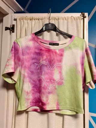 Camiseta corta con un llamativo estampado tie-dye en tonos rosas y verdes. Presenta un diseño de corazón con detalles brillantes en el centro. - Diseño de corazón - Estampado tie-dye vibrante. - Corte crop top.