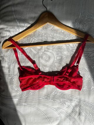Sujetador de encaje con un diseño delicado y femenino. - Color rosa vibrante. - Tejido de malla transparente con topos. - Detalle de lazo pequeño en el centro.