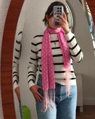 Pañuelo rosa con lunares blancos y flecos en los extremos. Tacto de seda. Completamente nuevo. El color es más como en la segunda foto. Súper alegre para cualquier look! 🌸 Acepto ofertas razonables