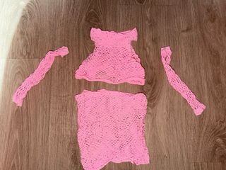 Conjunto de dos piezas formado por un top y una falda con estampado Love en rosa y blanco. El top tiene un detalle de pelo sintético en el escote. Tiene una peuqeña manchita que no se nota nada - Top sin mangas. - Falda corta. - Estampado repetido de Love.