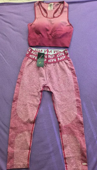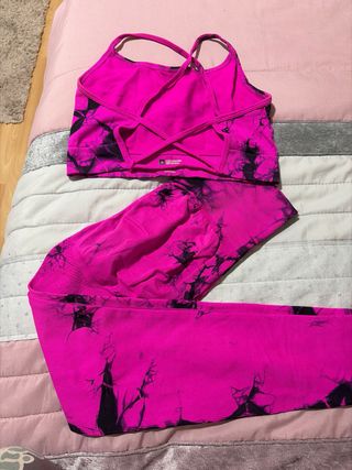 Conjunto de deporte de color rosa. Set compuesto por un top/sujetador deportivo y unas mallas largas. Talla M, de Shein. En buen estado!